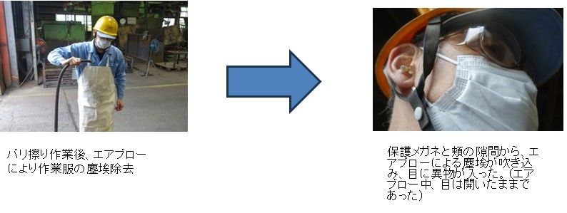 ・着用する保護メガネ(ゴーグル含む)が体型に合ったものではなかったため、エアブローによる塵埃の除去方法が不明確で安全指導が不十分であった。